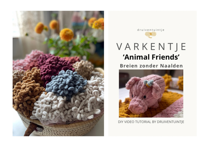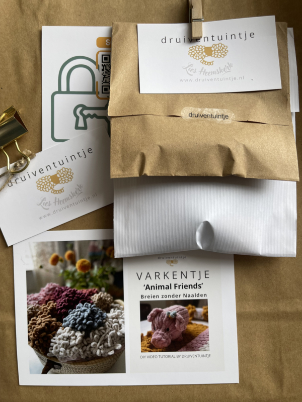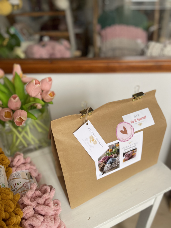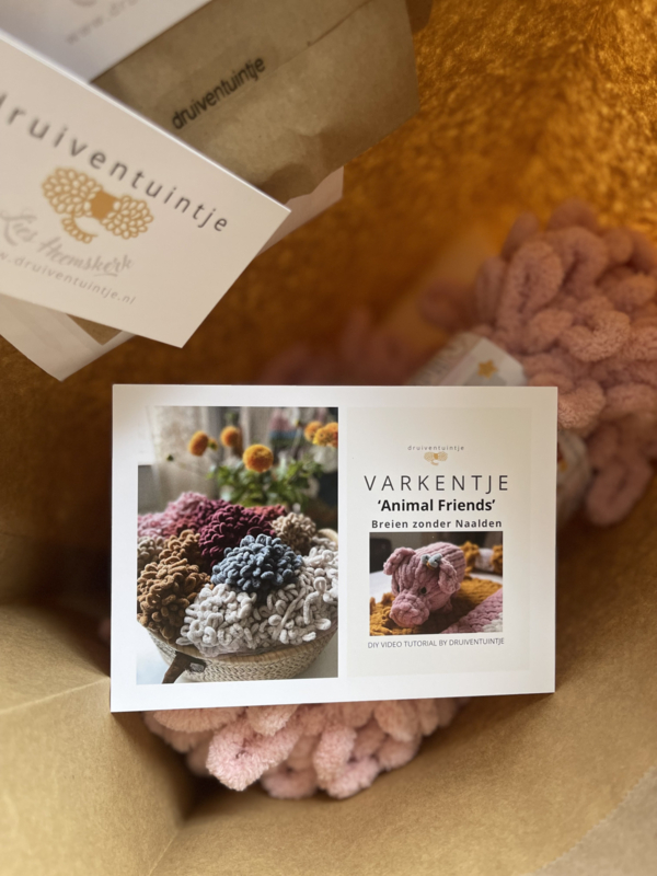 Ontvang thuis je DIY BOX met alle materialen voor het VARKENTJE 🐷Roze LUS-garen, de vulling en de oogjes. En met een linkje naar de leuke uitleg VIDEO leert Lies je stap voor stap hoe je met enkel je vingers dit Varkentje breidt.